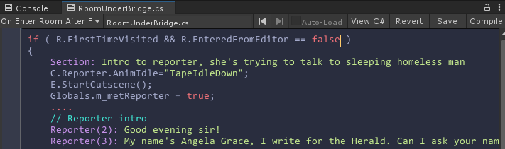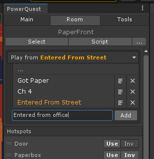 Sometimes you have rooms you revisit a lot, at different times in the game, and you dont want to have to play all that stuff just to test a later section. That's where "Play from functions" come in handy!
